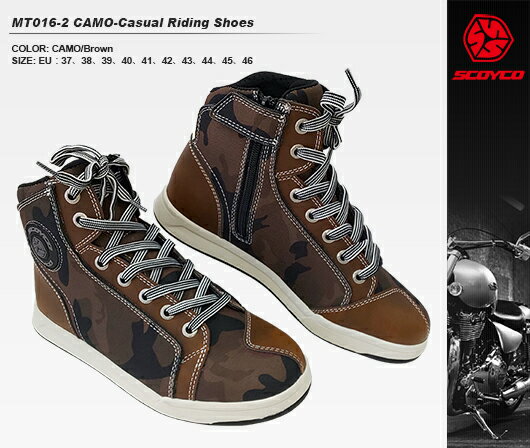 シンプルで落ち着いた印象の【CAMO/Grey】 迷彩色強めで個性を主張する【CAMO/Brown】 ◆MT016の後継モデル(サイドジップカバー付き) ◆バイク用ライディングシューズながらカジュアルな雰囲気のスニーカータイプ ◆ハイカットデザインとサイドジップの組合わせで、脱ぎやすく、また不意に脱げにくい ◆くるぶし部にはプロテクターを装備 ◆シフトペダルから足や靴を守るシフトパッド付き ◆剛性の高いソールは足首を捻ることを防止CAMO/Brown予約ページはこちら商品名【SCOYCO(スコイコ)】迷彩カジュアルライディングシューズ【MT016-2 CAMO】サイズEU:37、38、39、40、41、42、43、44、45、46カラーCAMO/Grey( カモ/ グレイ)、CAMO/Brown( カモ/ ブラウン)メーカーSCOYCO(スコイコ)