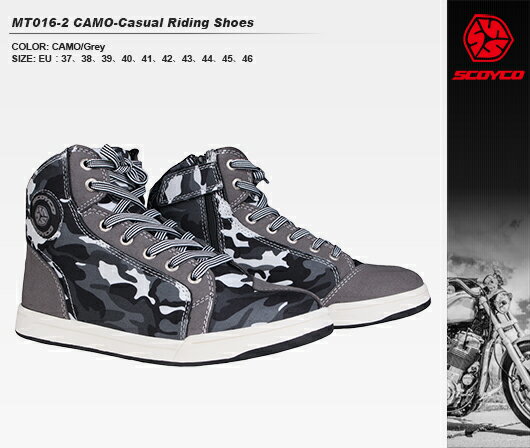 シンプルで落ち着いた印象の【CAMO/Grey】 迷彩色強めで個性を主張する【CAMO/Brown】 ◆MT016の後継モデル(サイドジップカバー付き) ◆バイク用ライディングシューズながらカジュアルな雰囲気のスニーカータイプ ◆ハイカットデザインとサイドジップの組合わせで、脱ぎやすく、また不意に脱げにくい ◆くるぶし部にはプロテクターを装備 ◆シフトペダルから足や靴を守るシフトパッド付き ◆剛性の高いソールは足首を捻ることを防止CAMO/Brown予約ページはこちら商品名【SCOYCO(スコイコ)】迷彩カジュアルライディングシューズ【MT016-2 CAMO】サイズEU:37、38、39、40、41、42、43、44、45、46カラーCAMO/Grey( カモ/ グレイ)、CAMO/Brown( カモ/ ブラウン)メーカーSCOYCO(スコイコ)